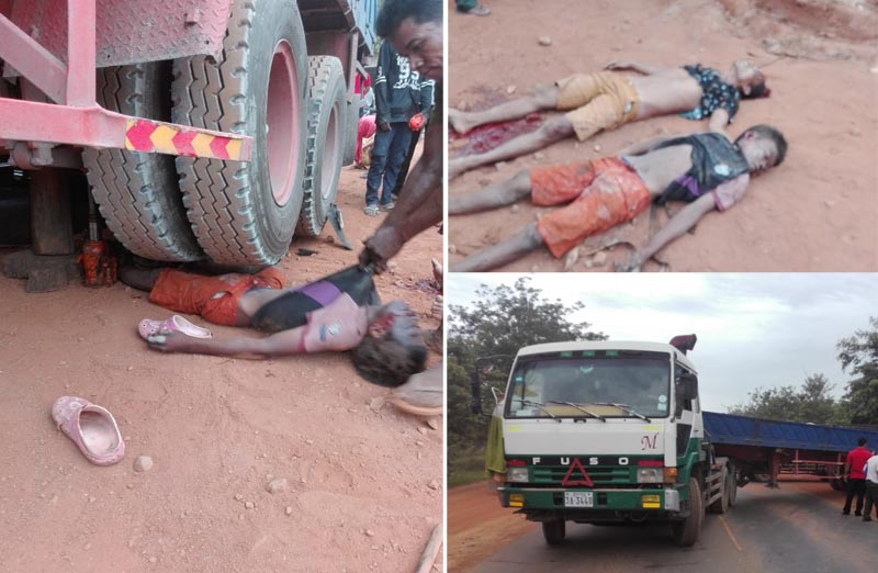 រថយន្តធុនធំសណ្ដោងរ៉ឺម៉កបើកបត់ឆ្លងផ្លូវបុកម៉ូតូពេញទំហឹងផ្ដាច់ជីវិតបុរស2នាក់នៅកន្លែងកើតហេតុ