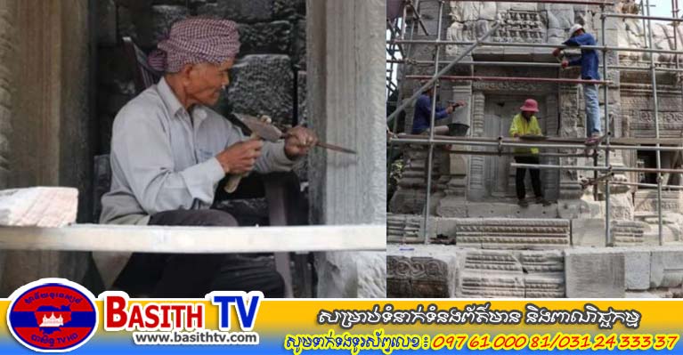 ក្រុមកម្មករជួសជុលប្រាសាទបុរាណ បានបង្ហាញនូវទឹកចិត្តរីករាយ បន្ទាប់ពីបានបញ្ចប់ការជួសជុលប្រាង្គកណ្តាលនៃប្រាសាទតាព្រហ្មកិលរួចរាល់