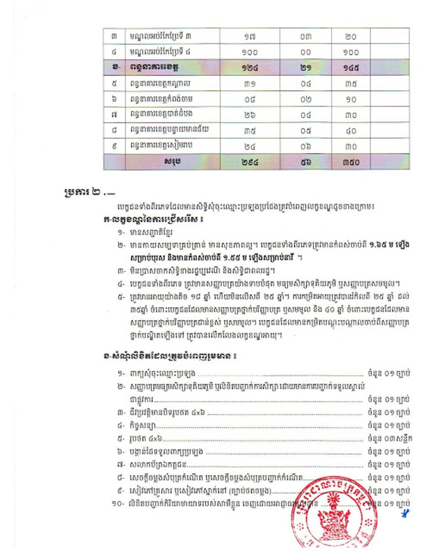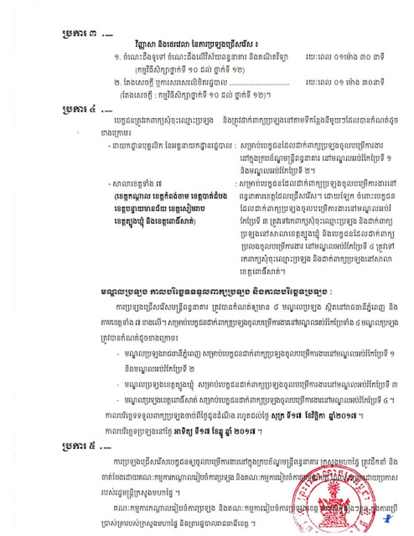 ក្រសួងមហាផ្ទៃសម្រេចបើកឲ្យមានការប្រឡងជ្រើសរើសសិស្សនិស្សិតបញ្ចូលក្នុងក្របខ័ណ្ឌមន្ត្រីពន្ធនាគារក្រសួងមហាផ្ទៃចំនួន ៣៥០នាក់ សម្រាប់ឆ្នាំ២០១៧ដើម្បីចាត់ឲ្យទៅបម្រើការងារនៅមណ្ឌលអប់រំកែប្រែទី១ មណ្ឌលអប់រំកែប្រែទី២ មណ្ឌលអប់រំកែប្រែទី៣ មណ្ឌលអប់រំកែប្រែទី៤ ពន្ធនាគារខេត្តកណ្តាល ពន្ធនាគារខេត្តកំពង់ចាម ពន្ធនាគារខេត្តបាត់ដំបង ពន្ធនាគារខេត្តបន្ទាយមានជ័យ នឹងពន្ធនាគារខេត្តសៀមរាប។