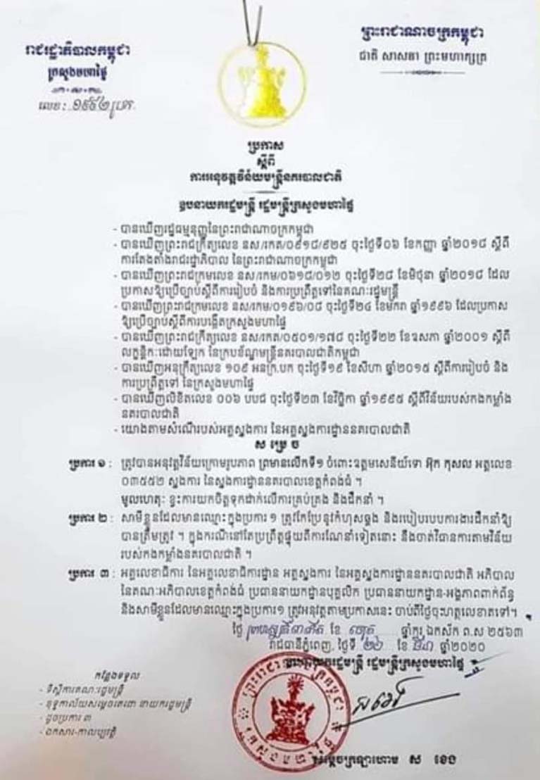 ក្នុងករណីនៅតែប្រព្រឹត្តផ្ទុយពីការណែនាំទៀតនោះ នឹងចាត់វិធានការតាមវិន័យ របស់កងកម្លាំងនគរបាលជាតិ៕