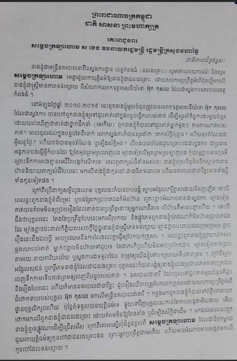 នៅក្នុងពាក្យបណ្តឹងពីនគរបាលនារីចំនួន ៤រូបផ្តិតមេដៃ នៅថ្ងៃទី៣០ ខែកក្កដា ឆ្នាំ២០២០ បានលើកឡើងថា នាងខ្ញុំជាមន្ត្រីនតរបាលនារីនៃស្នងការដ្ឋាន ខេត្តកំពង់ធំ (ជនរងគ្រោះ) សូមគោរពរាយការណ៍ និងសូមសម្តេចក្រឡាហោម មេត្តាជួយរកយុត្តិធម៌ឱ្យនាងខ្ញុំជាជនរងគ្រោះ ដោយសារការប្រព្រឹត្តអំពើពុំគប្បីមកលើ នាងខ្ញុំជាស្ត្រីមានភាពទន់ខ្សោយ ពីសំណាក់លោកឧត្តមសេនីយ៍ទោ អ៊ុក កុសល ដែលជាស្នងការនគបាលខេត្ត កំពង់ធំ ។