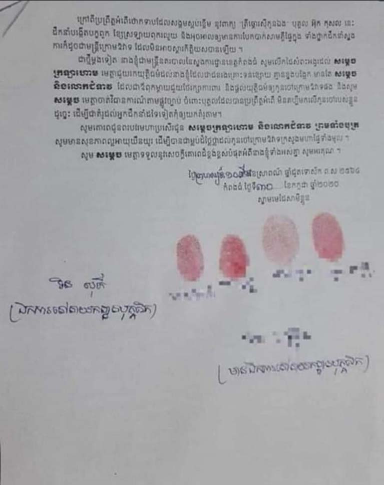 ជាថ្មីម្តងទៀត នាងខ្ញុំជាមន្ត្រីនគរបាលនៃស្នងការដ្ឋានខេត្តកំពង់ធំ សូមលើកដៃសំពះអង្វរដល់ សម្តេច ក្រឡារហាម មេត្តាជួយរកយុត្តិធម៌ដល់នាងខ្ញុំដែលជាជនរងគ្រោះទន់ខ្សោយ គ្មានខ្នងបង្អែក មានតែ សម្តេច និងលោកស្រី ដែលជាឪពុកម្តាយជួយថែរក្សាការពារ និងផ្តល់យុត្តិធម៌ឲ្យកូនចៅក្រោមឱវាទផង និងសូម សម្តេច មេត្តាចាត់វិធានការណ៍តាមផ្លូវច្បាប់ ចំពោះបុគ្គលដែលបានប្រព្រឹត្តអំពើ មិនគប្បីមកលើកូនចៅរបស់ខ្លួន ដូច្នេះ ដើម្បីជាគំរូដល់អ្នកដឹកនាំដទៃទៀតកុំឲ្យយកគំរូតាម។