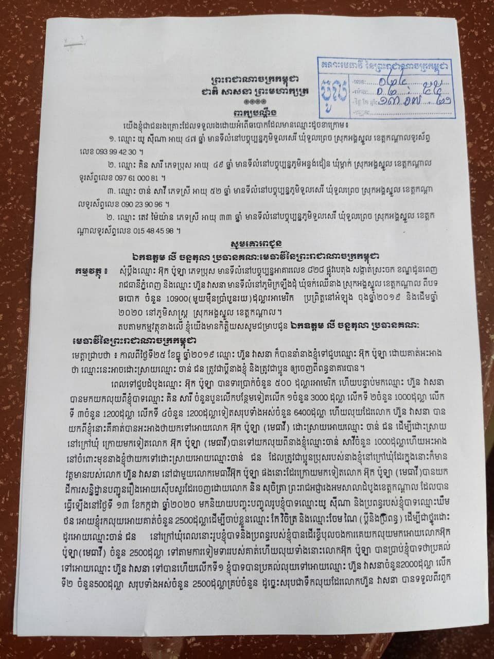 មិនត្រឹមតែប៉ុណ្ណោះនោះទៀតសោត ក្រោយពីរពួកគាត់បានដាក់ពាក្យបណ្តឹងចូលទៅកាន់កងរាជអាវុធហត្ថស្រុកងអង្គស្នួលហើយរួចរាល់ហើយនោះ សំរាប់បានប្រម៉ានជាពីរថ្ងៃក្រោយមក ក៏តែលេចមុខលោក ហួន វាសនា ជំនួយការមេធាវីរូបនោះ បានទៅដល់ផ្ទះរបស់ពួកគាតទាំងព្រលឹម ហើយបាននិយាយបោះពាក្យបោះសម្តីហាក់ដូចជាគំរាមកំហែងពួកគាត់ថា គាត់មិនដែលបោកអ្នកណាទេ គាតមានលុយមានឡានដឹកដីជាច្រើនគ្រឿងយ៉ាងហាចណាស់ក៏គាត់អាចរកប្រាក់ចំណូលក្នុងមួយថ្ងៃបាន10000ដុល្លា(មួយម៉ឺនដុល្លា)ឯនោះ ហើយបើទោះប្តឹងក៍មិនឈ្នះគាត់នោះដែរ។ ក្រោយពីលោកហួន វាសនា បានទៅដល់ផ្ទះពួកគាត់ ហើយបោះពាក្យសម្តីគំរាមកំហែងពួកគាត់យ៉ាងដូច្នេះហើយនោះ ទើបបានពួកគាត់ពិភាក្សាគ្នានឹងហើយការសម្រេចចិត្តសាជាថ្មី ហើយនាំគ្នាដាក់ពាក្យបណ្តឹងប្តឹងលោក អ៊ុក ប៉ូឡា នឹងលោកហួន វាសនា ដែលជាជំនួការមេធាវីរូបនោះទៅកាន់អាយ្យការអមសាលាដំបូងខេត្តកណ្តាល នឹងដាក់បណ្តឹងប្តឹងចូលកាន់ឯកឧត្តម លី ចន្ទតុលា ប្រធានគណ:មេធាវីនៃព្រះរាជាណាចក្រកម្ពុជា ដើម្បីអោយអោយឯកឧត្តមជួយដោះស្រាយ នឹងកាត់សេចក្តីជូនពួកគាត់ដែលជាពលរដ្ឋក្រីក្ររងគ្រោះ ព្រោះតែរឿងឆបោកដូចខាងលើនោះប្រកបយុត្តិធម៌ ដោយអនុគ្រោះអនុគ្រោះផង ៕