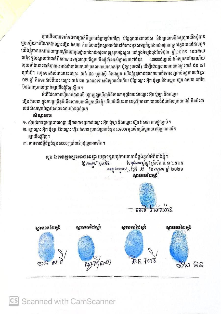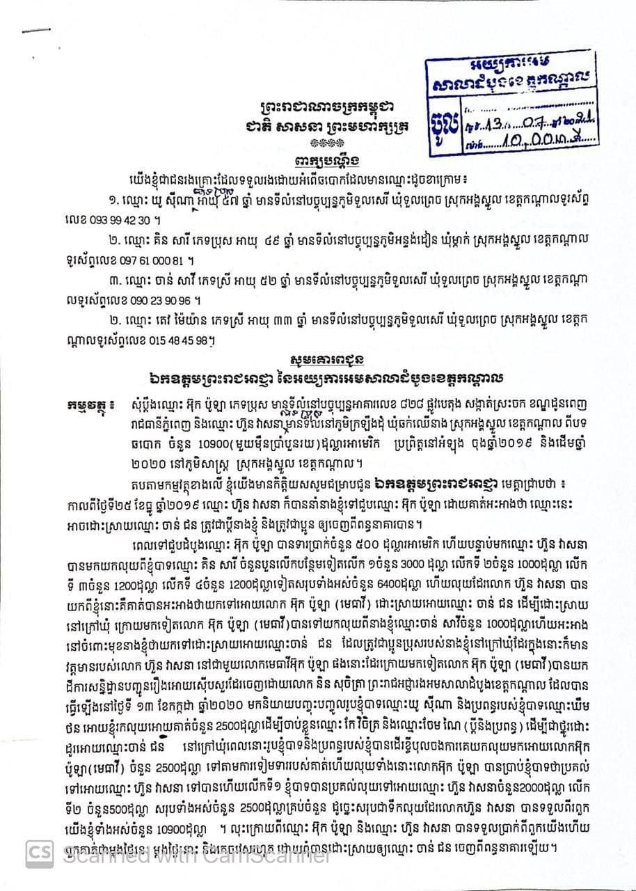 ក្រោយពីក្រុមគ្រួសារនឹងបងប្អូនរបស់លោកចាន់ ជន បានដាក់ពាក្យបណ្តឹង ប្តឹង លោកមេធាវី អ៊ុក ប៉ូឡា នឹងលោក ហួន វាសនា ចូលទៅកាន់លោកមេបញ្ជាការកងរាជអាវុធ ស្រុកអង្គស្នួលទាមទាលុយ របស់ពួកគាត់ចំនួន 10900 ដុល្លា ថ្លៃដែលពួកគាត់ថ្លៃការពារក្តី នឹងលុយថ្លៃដោះស្រាយ ក្នុងការធានាខ្លួនលោក ចាន់ ជន នៅក្រៅឃុំ ដែលលោក អ៊ុក ប៉ូឡា នឹងលោក ហ៊ួន វាសនា ដែលជាជំនួយការដ៍មហាអស្ចារ្យនៅភូមិក្រឡឹងដុំ ឃុំ ឆក់ឈើនាង ស្រុកអង្គស្នួល ខេត្តកណ្តាល សព្វថ្ងៃនេះ ដែលអស់លោកទាំងពីរនាក់នោះ មិនធ្វើការដោះស្រាយអោយពួកគាត់អស់រយៈជាងមួយឆ្នាំមកហើយ ចំណែកឯលោក ចាន់ ជន វិញនោះ ក៏នៅជាប់ឃុំនៅក្នុងពន្ធនាគារតែដដែលនោះដែរ ហើយលោកចាន់ ជន ក៍បានអនុវត្តទោសទណ្ឌនៅក្នុងពន្ធនាគារ ខេត្តកណ្តាល រហូតមកដល់សព្វថ្ងៃ នៅសល់តែជាង 5 ខែ តែប៉ុណ្ណោះនោះដែរ ។ ក្រោយលោកមេធាវី អ៊ុក ប៉ូឡានឹង លោកហ៊ួន វាសនា ដែលជាជំនួយការដ៍ជំនិតរបស់គាត់រូបនោះ បានទទួលលុយកាក់ប្រាក់កាសពីពួកគាត់ដែលជាជនរងគ្រោះទាំងនោះគ្រប់ចំនួនហើយ ពួកគាត់ខលទូរស័ព្ទទៅក៏មិនលើក ណាត់ជួបក៏មិនជួបនោះដែរ ពោលគឺគេចវេសពីពួកគាត់ រហូត ទើបបានជាពួកគាត់ធ្វើការសម្រេចនាំគ្នាមកដាក់ពាក្យបណ្តឹងមកកាន់លោកមេបញ្ជាការកងរាជអាវុធស្រុកអង្គស្នួល ដើម្បីអោយលោកមេបញ្ជាការស្រុកអង្គស្នួលជួយធ្វើការដោះស្រាយនឹងធ្វើការសម្របសម្រួល រកយុត្តិធម៌ជូនដល់ពួកគាត់នៅក្នុងគ្រានោះតែម្តងទៅ ។