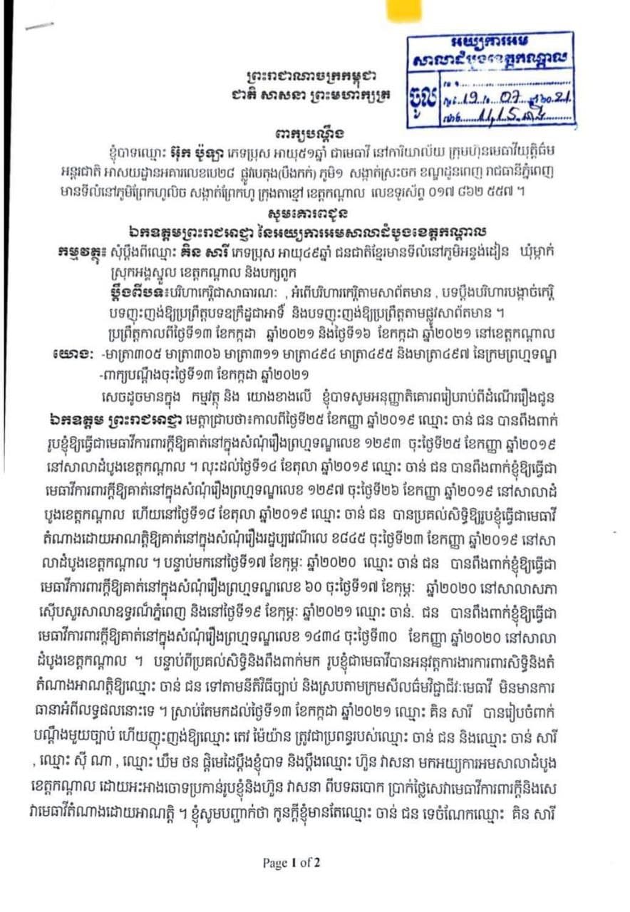 អង្គស្នួល កណ្តាល ៖ ក្រោយពីរក្រុមការងារបាសិទ្ធTV យើងខ្ញុំបានធ្វើការចេញផ្សាយលាតត្រដាងអំពីរដំណើរដើមទងនៃសេចរឿង ដែលលោកធាវីអ៊ុក ប៉ូឡា នឹងលោកកហួន វាសនា ដែលជាជំនួយការរបស់គាត់ បានចូលខ្កួនមកដើរអះអាងការពារក្តីនឹងការពារក្តីអោយលោកចាន់ ជន ចាប់ពីរលោកចាន់ ជន ជាប់ឃុំនៅក្នុងពន្ធនាគារខេត្តកណ្តាលនៅក្នុអំឡុងឆ្នាំ 2019 ហើយចុងក្រោយលោកមេធាវីអ៊ុក ប៉ូឡា នឹងលោកហួន វាសនាជំនួយការរបស់គាត់ របស់គាត់ បានមកយកលុយពីរក្រុមគ្រួសារនឹងបងប្អូនរបស់លោកចាន់ជនដោយអះអាងថាយកទៅដោះស្រាយធានា ខ្លួន អោយលោកចាន់ ជន នៅក្រៅឃុំ ក្រោយមកលោកអ៊ុក ប៉ូឡា នឹងលោកហួន វាសនា ដែលជំនួយការរបស់គាត់បានយកដីការសន្និដ្ឋានបញ្ជូនរឿងអោយស៊ើបសួមួយសន្លឹកចេញដោយលោកទិន សុចិត្រា ព្រះរាជ្ញាររងអមសាលាដំបូងខេត្តកណ្តាលនឹងបានធ្វើឡើងនៅថ្ងៃទី13 កក្កដា 2020 នោះមកយកលុយពីរបងប្អូនលោកចាន់ ជនចំនួន2500ដុល្លាថែមទៀត ដោយបានអះអាងយ៉ាងច្បាស់ៗ នៅចំពោះមុខបងប្អូនលោក ចាន់ ជនថា នៅក្នុងហាងកា ហ្វេ ហ្គាឡាក់ស៊ីស្ថិតក្តាន់រយ ឃុំដំណាក់អំពិល នឹងនៅក្មុងហាងកាហ្វេមួយកន្លែងទៀត ដែលមានយីហោឈ្មោះថា ម៉ាណេ ស្ថិតនៅភូមិគីរីថ្មី ឃុំសំរោងលើ ស្រុកអង្គស្នួល ថា នេះដីដាក់ចាប់ខ្លួនលោកកែ វិចិត្រ នឹង លោកស្រី ចែក ណៃ ដែលភាគីប្តឹងផ្តល់គ្នាទៅវិញទៅមករឿងគ្រឿងចក្រពាក់ពន្ធ័ជាមួយលុយកាក់ប្រាក់កាស មួយចំនួនទៀត កាលពីរអំឡុងឆ្នាំ2019.ទៅតាមការលើកឡើងដោយជាក់ស្តែង របស់បងប្អូននឹងក្រុមគ្រួសាររបស់លោកចាន់ ជន នឹងយោងទៅតាមពាក្យបណ្តឹងរបស់ពួកគាត់ដែលពួកបានប្តឹងលោកទាំងពីរនោះនៅមូលដ្ឋានកងរាជអាវុធហត្ថ ស្រុកអង្គស្នួល នឹងយោងទៅតាមពាក្យបណ្តឹង ដែលពួកគាត់ប្តឹងលោកទាំងពីរនោះទៅកាន់អាយ្យការអមសាលាដំបូងខេត្តកណ្តាល នឹងទៅកាន់គណ:មេធាវីនៃព្រះរាជាណាចក្រកម្ពុជា អោយជួយរកយុត្តិធម៌ ជូនដល់បងប្អូនដែលជាប្រជាពលរដ្ឋក្រីក្រនឹងជាជនរងគ្រោះរួចមក ។