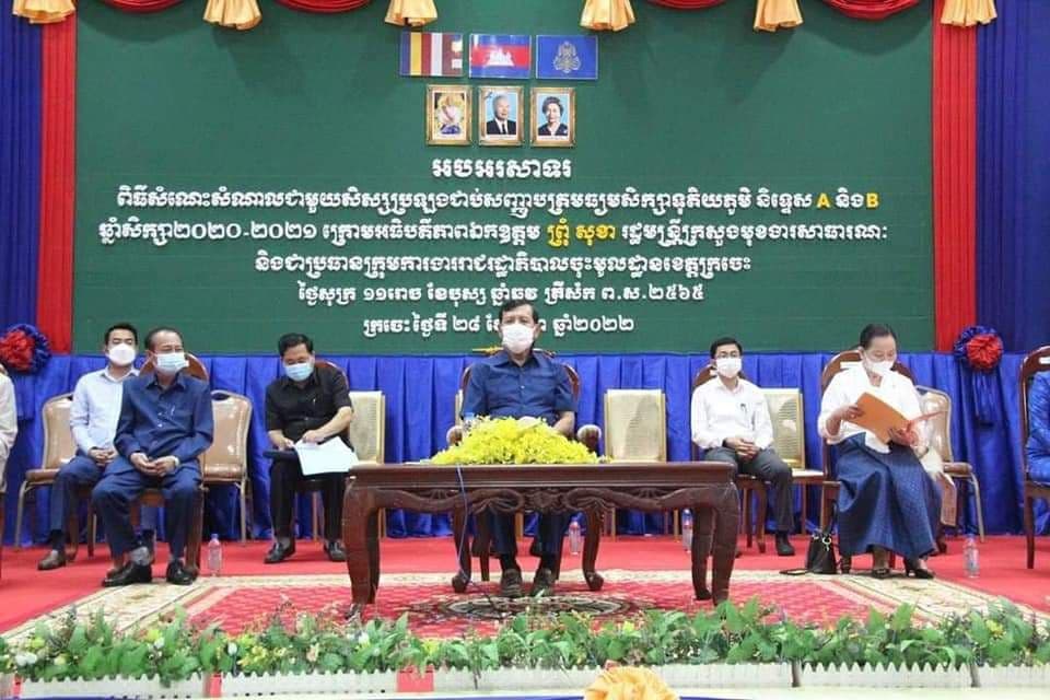 ថ្ងៃសុក្រ ១១រោច ខែបុស្ស ឆ្នាំឆ្លូវ ត្រីស័ក ព.ស.២៥៦៥ ត្រូវនឹងថ្ងៃទី២៨ ខែមករា ឆ្នាំ២០២២ ឯកឧត្តម ហឿ ស៊ីយ៉ែម ប្រធានក្រុមប្រឹក្សាខេត្ត និងឯកឧត្តម វ៉ា ថន អភិបាលខេត្ត អញ្ជើញចូលរួមក្នុងពិធីជួបសំណេះសំណាលមាតាបិតាអាណាព្យាបាល និងឧបត្ថម្ភថវិកាលើកទឹកចិត្តដល់សិស្ស ដែលប្រឡងជាប់មធ្យមសិក្សាទុតិយភូមិ និទ្ទេសA និងB ទូទាំងខេត្តក្រចេះ ក្រោមអធិបតីភាពឯកឧត្តម ព្រុំ សុខា រដ្ឋមន្ត្រីក្រសួងមុខងារសាធារណៈ និងជាប្រធានក្រុមការងាររាជរដ្ឋាភិបាលចុះមូលដ្ឋានខេត្តក្រចេះ ។