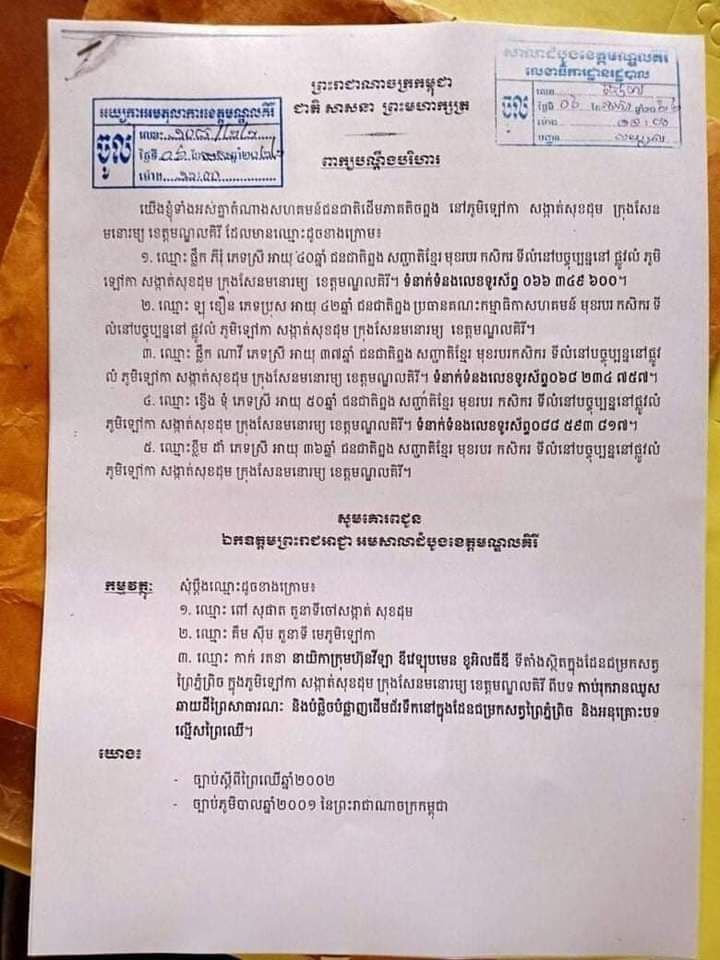 សូមបញ្ជាក់ថា ក្នុងពាក្យបណ្តឹងបរិហាររបស់សហគមន៍ ក្នុងនោះរួមមាន មេភូមិឡៅកា ចៅសង្កាត់សុខដុម និងនាយិកាក្រុមហ៊ុនវីឡា ឌីវេឡុបមេន ខូអិលធីឌី ពីបទ កាប់រុករានឈូសឆាយដីព្រៃសាធារណៈ និងបំផ្លិចបំផ្លាញដើមជ័រទឹក នៅក្នុងដែនជម្រកសត្វព្រៃភ្នំព្រិច និងអនុគ្រោះបទល្មើសព្រៃឈើ។