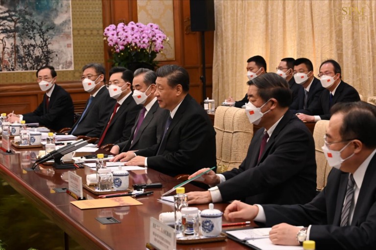 នៅព្រឹកថ្ងៃទី១០ ខែកុម្ភៈ ឆ្នាំ២០២៣ ដែលជាថ្ងៃទី២ នៃដំណើរបំពេញទស្សនកិច្ចផ្លូវការ នៅរដ្ឋធានីប៉េកាំង សាធារណរដ្ឋប្រជាមានិតចិន សម្តេចអគ្គមហាសេនាបតីតេជោ ហ៊ុន សែន នាយករដ្ឋមន្ត្រី នៃព្រះរាជាណាចក្រកម្ពុជា និងគណៈប្រតិភូជាន់ខ្ពស់រាជរដ្ឋាភិបាលកម្ពុជា បានអញ្ជើញជួបសំដែងការគួរសម ឯកឧត្តម ស៊ី ជិនពីង(Xi Jinping) ប្រធានាធិបតី នៃសាធារណរដ្ឋប្រជាមានិតចិន។ ក្នុងជំនួបដែលធ្វើឡើងនៅផ្ទះសំណាក់រដ្ឋ Diao Yutai រដ្ឋធានីប៉េកាំង ឯកឧត្តម ស៊ី ជិនពីង មានប្រសាសន៍សំដែងនូវការស្វាគមន៍ចំពោះសម្តេចតេជោនាយករដ្ឋមន្ត្រី ជាមេដឹកនាំពិភពលោកលើកទី១ ដែលបានអញ្ជើញមកបំពេញទស្សនកិច្ចនៅប្រទេសចិន បន្ទាប់ពីពិធីចូលឆ្នាំថ្មីរបស់ប្រជាជនចិន។ សម្តេចតេជោបានអបអរសាទរ ចំពោះការអញ្ជើញនេះ។ សម្តេចបានមានប្រសាសន៍បន្តថា កាលដែលសម្តេចអញ្ជើញមកាន់ប្រទេសចិន កាលពីថ្ងៃទី៥ ខែកុម្ភៈឆ្នាំ២០២០ ពេលដែលផ្ទុះកូវីដយ៉ាងខ្លាំងនោះ គឺចង់លើកទឹកចិត្តនិស្សិមួយចំនួននៅវ៉ូហាន និងម្យ៉ាងវិញទៀត សម្តេចក៏ដូចជាកម្ពុជាចង់ឈរនៅជាមួយប្រជាជនចិន នៅពេលជួបគ្រាលំបាក។
