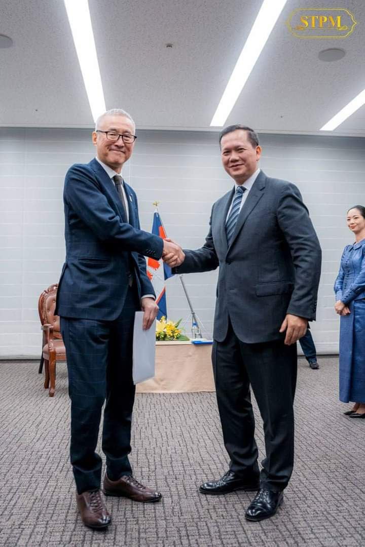 (ទីក្រុងតូក្យូ) ៖ នាព្រឹកថ្ងៃអង្គារ ៧កើត ខែមិគសិរ ឆ្នាំថោះ បញ្ចស័ក ព.ស. ២៥៦៧ ត្រូវនឹង ថ្ងៃទី១៩ ខែធ្នូ ឆ្នាំ២០២៣ សម្តេចមហាបវរធិបតី ហ៊ុន ម៉ាណែត នាយករដ្ឋមន្ត្រី នៃព្រះរាជាណាចក្រកម្ពុជា បានអនុញ្ញាតឱ្យលោក អូបាយ៉ាស៊ី តាកេអុ (OBAYASHI TAKEO) ប្រធានផ្នែកទំនាក់ទំនងអន្តរជាតិ តំណាងសហព័ន្ធសេដ្ឋកិច្ចតំបន់កាន់សៃ និងជាប្រធានក្រុមហ៊ុន OBAYASHI CORPORATION ចូលជួបសម្តែងការគួរសម ក្នុងឱកាសនៃការចូលរួមកិច្ចប្រជុំកំពូលរំឭកខួបអនុស្សាវរីយ៍អាស៊ាន-ជប៉ុន លើកទី៥០ ចាប់ពីថ្ងៃទី១៥-១៩ ខែធ្នូ ឆ្នាំ២០២៣ នៅទីក្រុងតូក្យូ ប្រទេសជប៉ុន ។