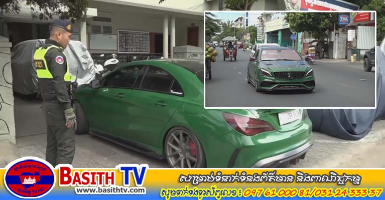 រថយន្តមួយគ្រឿងម៉ាក Mercedes CLA 45 ពណ៌ស(បិទស្កុត ពណ៌ត្រួយចេក) ស្លាកលេខ 2BR-9829 បំពាក់បំពង់ស៊ីម៊ាំងកែច្នៃ បង្កឲ្យមានសម្លេងរំខានដល់ប្រជាពលរដ្ឋ និងបង្កឲ្យបាត់បង់សណ្ដាប់ធ្នាប់សាធារណ: ត្រូវបានកម្លាំងមូលដ្ឋានអាវុធហត្ថខណ្ឌទួលគោក រាជធានីភ្នំពេញ ធ្វើការឃាត់ម្ចាស់មកអប់រំ កាលពីវេលាម៉ោង១៣:៣០នាទី ថ្ងៃទី២៤ ខែធ្នូ ឆ្នាំ២០២៣ នៅចំណុចផ្លូវ២៦៥ សង្កាត់ទឹកល្អក់២ ខណ្ឌទួលគោក។