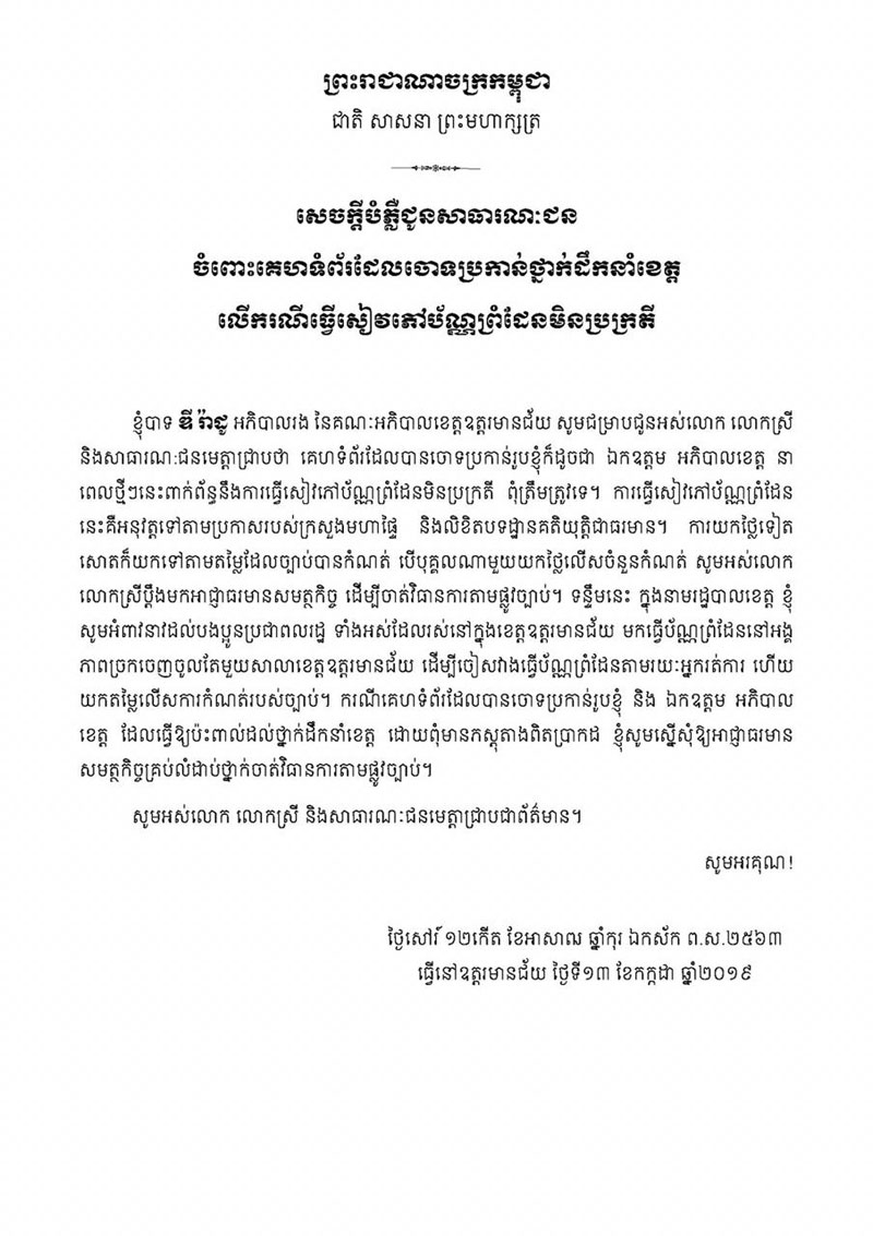 លោកសូមអោយអាជ្ញាធរមានសមត្ថកិច្ចគ្រប់លំដាប់ថ្នាក់ចាត់វិធានការតាមផ្លូវច្បាប់ចំពោះសារព័ត៍មានគេហទំពរ័ណាដែលហ៊ានសរសេរិះគន់មកលើរូបលោកនិងឯកឧត្ដមអភិបាលខេត្ត។