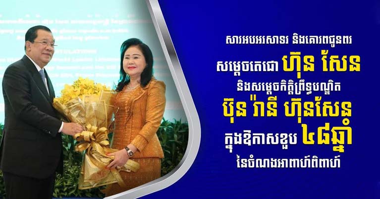 នៅក្នុងឱកាសដ៏សិរីមង្គលាភិរម្យប្រសើរថ្លៃថ្លានេះ យើងខ្ញុំសូមគោរពអនុញ្ញាតសម្តែងនូវអំណរសាទរ យ៉ាងស្មោះអស់ពីដួងចិត្ត ប្រកបដោយមនោសញ្ចេតនា រំភើបរីករាយក្រៃលែង និងសូមបួងសួងដល់ទេវតាសូមប្រសិទ្ធពរជ័យ ដល់ចំណងអាពាហ៍ពិពាហ៍ ដែលបានកើតឡើងក្នុងគ្រាដ៏សែនកម្សត់នោះ ឱ្យកាន់តែផ្អែមល្ហែម ត្រជាក់ត្រជំដូចទឹកអម្រឹត និងសូមប្រកបដោយសុខភាពល្អបរិបូណ៍ កម្លាំងពលំមាំមួន ជន្មាយុយឺនយូរ និងសម្រេចបានជោគជ័យយ៉ាងត្រចះត្រចង់ ក្នុងការបន្តចូលរួមដឹកនាំប្រទេស ដើម្បីអភិវឌ្ឍលើគ្រប់វិស័យ មានភាពរីកចម្រើនរុងរឿង ក្រោមដំបូលមហាសន្តិភាព ស្ថិរភាពជានិច្ចនិរន្តរ៍តរៀងទៅ។