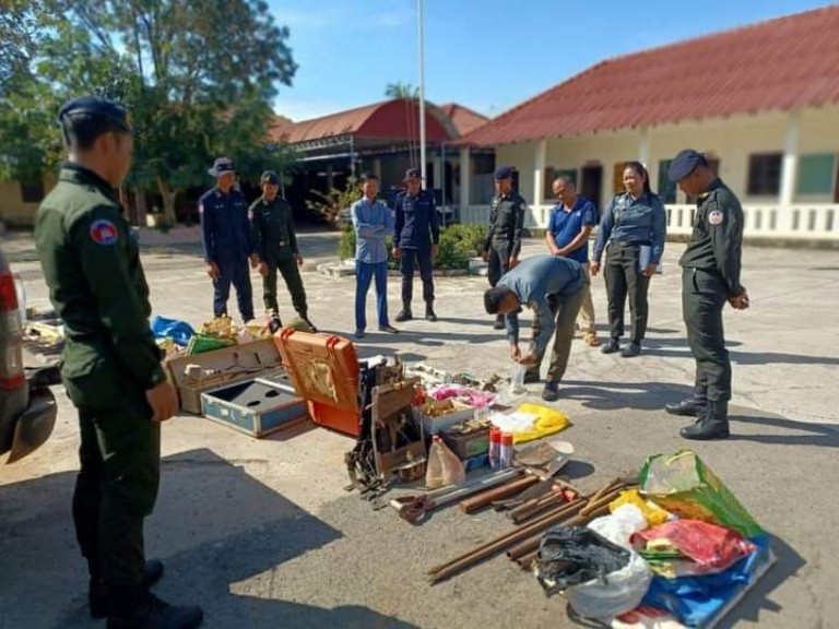 លោកថា:ក្នុងការបង្ក្រាបនេះយើងបានដកហូតវត្ថុតាងរួមមានរថយន្ត១គ្រឿងម៉ាកFORD RAVGER ពណ៌ខ្មៅ ពាក់ស្លាកលេខ ភ្នំពេញ 2BB-1383 ដែលជនសង្ស័យកំពុងបើករត់គេចចេញពីកន្លែងកើតហេតុ ចាប់យកវត្ថុតាងនៅកន្លែងកើតហេតុរួមមាន÷ ម៉ាស៊ីខួងរ៉ែ ២គ្រឿង, ម៉ាស៊ីនគោយន្ត ២គ្រឿង, ទុយោជ័រ៤, ហ្វុយដាក់ទឹក៤,ដែកបំពង់ទីប៤៦ដើម, ដែកបំពុងទីបធ្វើជើងជ្រែងទប់ម៉ាស៊ីន១២កំណាត់។