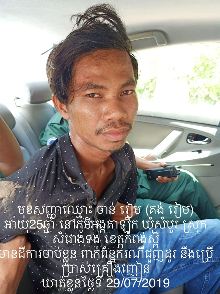 កម្លាំងសមត្ថកិច្ចជំនាញ នៃ អធិការដ្ឋាននគរបាលស្រុកសំរោងទងបានឃាត់មុខសញ្ញាម្នាក់ឈ្មោះ គង់ រៀម (ចាន់ រៀម )ភេទប្រុស អាយុ 29 ឆ្នាំនៅភូមិអង្គតាឡឹក ឃុំសំបូរ ស្រុកសំរោងទង ខេត្តកំពង់ស្ពឺ តាមដីកាបង្គាប់អោយចាប់ខ្លួន ក្រោយឃាត់ខ្លួនមុខសញ្ញាខាងលើយើងបានឆែកឆេរខ្លួនរកឃើញគ្រឿងញៀនចំនួន 1កញ្ចប់ធំ ។