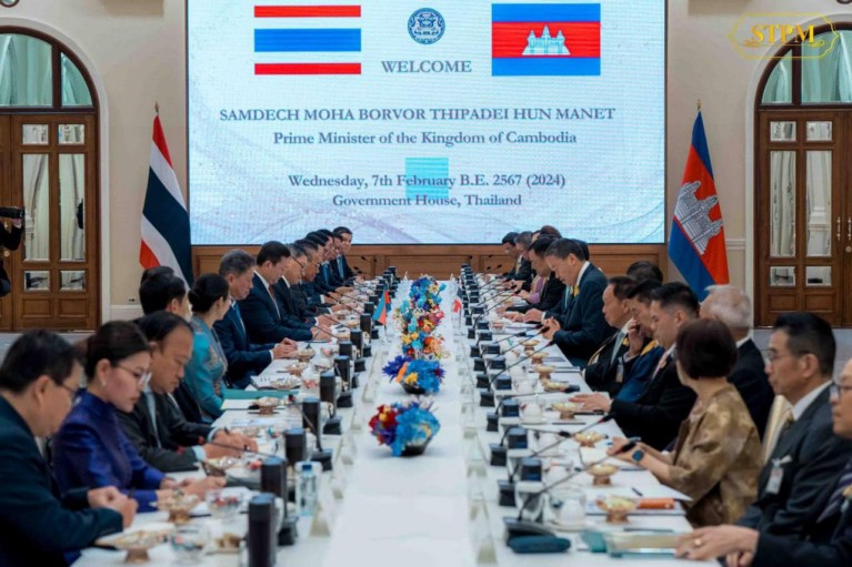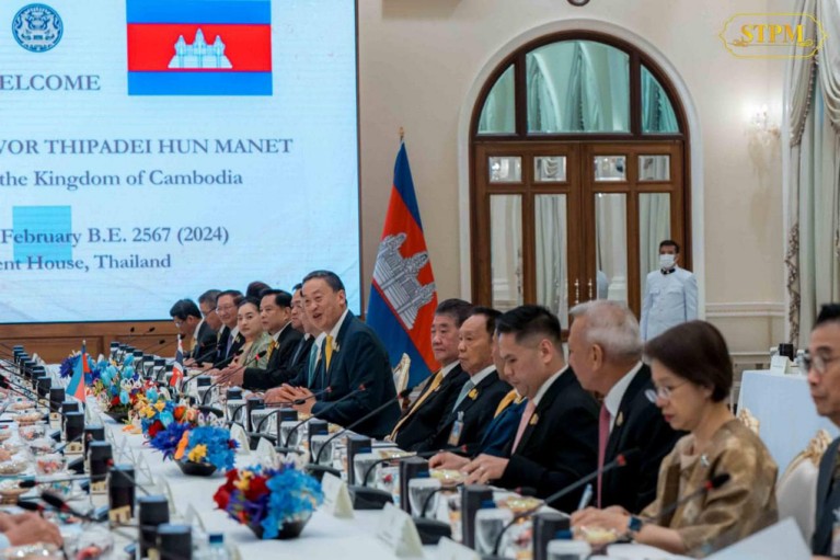 នៅព្រឹកថ្ងៃពុធ ១៣រោច ខែបុស្ស ឆ្នាំថោះ បញ្ចស័ក ពុទ្ធសករាជ ២៥៦៧ ត្រូវនឹងថ្ងៃទី៧ ខែកុម្ភ: ឆ្នាំ២០២៤ សម្តេចមហាបវរធិបតី ហ៊ុន ម៉ាណែត នាយករដ្ឋមន្ត្រី នៃព្រះរាជាណាចក្រកម្ពុជា បានជួបប្រជុំពិភាក្សាការងារទ្វេភាគីជាមួយ ឯកឧត្តម សេដ្ឋា ថាវីស៊ីន (Srettha Thavisin) នាយករដ្ឋមន្ត្រី នៃព្រះរាជាណាចក្រថៃ ក្នុងឱកាសនៃដំណើរបំពេញទស្សនកិច្ចផ្លូវការ នៅព្រះរាជាណាចក្រថៃ។