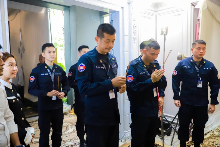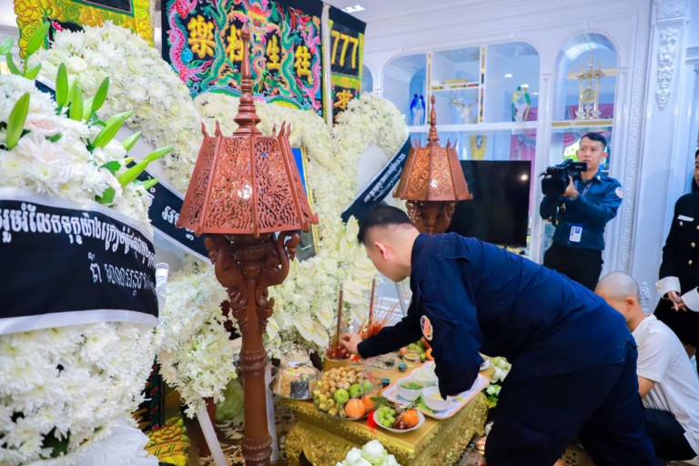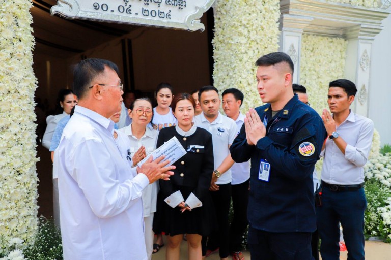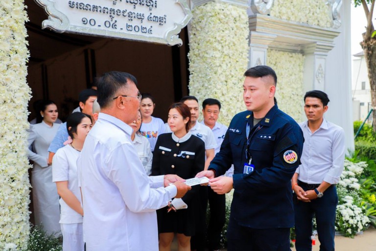 នាល្ងាច ថ្ងៃទី១២ ខែមេសា ឆ្នាំ២០២៤ លោកវរសេនីយ៍ឯក សៀ ទីន នាយសេនាធិការ កងរាជអាវុធហត្ថរាជធានីភ្នំពេញ តំណាងលោកឧត្តមសេនីយ៍ឯក រ័ត្ន ស្រ៊ាង មេបញ្ជាការរង កងរាជអាវុធហត្ថលើផ្ទៃប្រទេស ជាមេបញ្ជាការ កងរាជអាវុធហត្ថរាជធានីភ្នំពេញ បានដឹកនាំក្រុមការងារនាំយកថវិកាចំនួន ២,០០០,០០០៛, អង្ករ ០៥ការុង ទៅចូលរួមរំលែកទុក្ខដ៏ក្រៀមក្រំដល់គ្រួសារសព លោក ឈួរ ឈុនហួរ ជាស្វាមីម្ចាស់ប្រេន Lakamo ដែលបានទទួលមរណភាព កាលពីវេលាម៉ោង១១យប់ ថ្ងៃពុធ ទី១០ ខែមេសា ឆ្នាំ២០២៤ ក្នុងជន្មាយុ៤៣ឆ្នាំ ស្ថិតនៅសង្កាត់បាក់ខែង ខណ្ឌជ្រោយចង្វារ រាជធានីភ្នំពេញ។ លោកវរសេនីយ៍ឯក សៀ ទីន បានដុតធូបគោរពនូវវិញ្ញាណក្ខន្ធសព ដោយមនោសញ្ចេតនាសោកស្តាយ និងបានបួងសួងសូមឲ្យ វិញ្ញាណក្ខន្ធនៃសព បានទៅកាន់សុគតិភពកុំបីឃ្លៀងឃ្លាតឡើយ៕