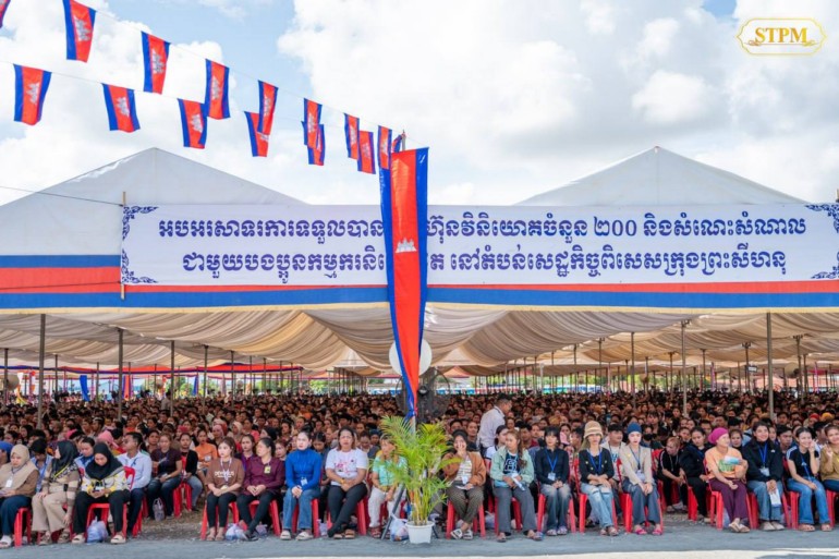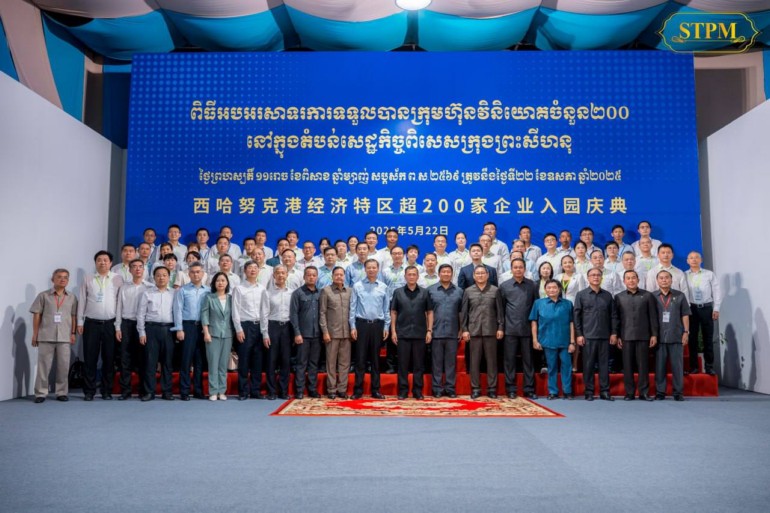 ខេត្តព្រះសីហនុ ៖ នាព្រឹកថ្ងៃព្រហស្បតិ៍ ទី២២ ឧសភា ២០២៥ សម្តេចមហាបវរធិបតី ហ៊ុន ម៉ាណែត នាយករដ្ឋមន្ត្រីនៃព្រះរាជាណាចក្រកម្ពុជា បានអញ្ជើញជាអធិបតីដ៏ខ្ពង់ខ្ពស់ ក្នុងពិធីអបអរសាទរការទទួលបានក្រុមហ៊ុនវិនិយោគចំនួន ២០០ និង សំណេះសំណាលជាមួយកម្មករ-និយោជិត នៅតំបន់សេដ្ឋកិច្ចពិសេសក្រុងព្រះសីហនុ ស្ថិតក្នុងសង្កាត់បិតត្រាង ក្រុងកំពង់សោម ខេត្តព្រះសីហនុ ។