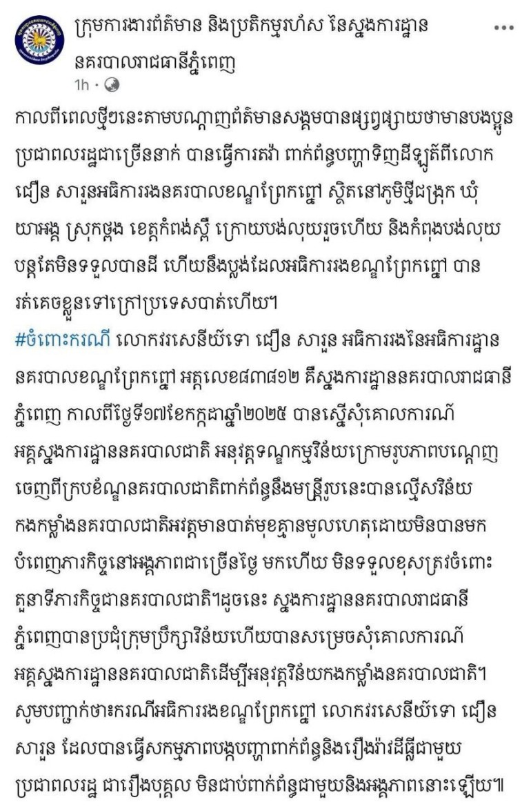 ស្នងការដ្ឋាននគរបាលរាជធានីភ្នំពេញ បញ្ជាក់ថា ករណីអធិការរងខណ្ឌព្រែកព្នៅ លោកវរសេនីយ៍ទោ ជឿន សារួន ដែលបានធ្វើសកម្មភាពបង្កបញ្ហាពាក់ព័ន្ធនិងរឿងរ៉ាវដីធ្លីជាមួយប្រជាពលរដ្ឋ ជារឿងបុគ្គល មិនជាប់ពាក់ព័ន្ធជាមួយ និងអង្គភាពនោះឡើយ៕