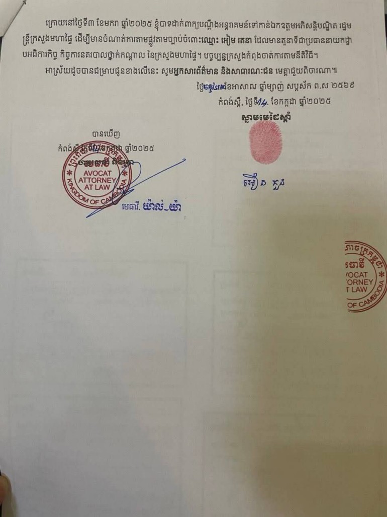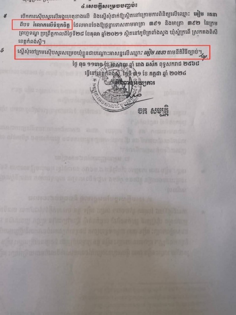 -ទោះជាយ៉ាងណាក្ដី ជនរងគ្រោះខាងលើ សុំស្នើយ៉ាងទទូចដល់ ឯកឧត្ដម ឡុង កេសភីរម្យ ប្រធានសាលាដំបូងខេត្តកំពង់ស្ពឺ.ឯកឧត្តម កើត រិទ្ធ ឧបនាយករដ្ឋមន្ត្រី រដ្ឋមន្ត្រី