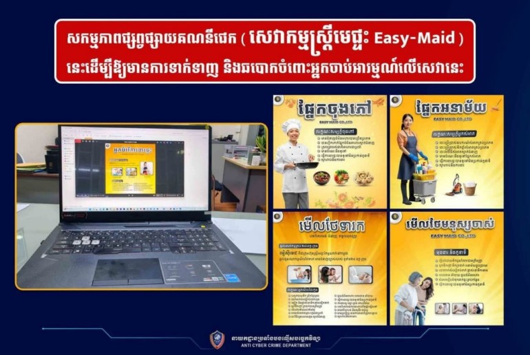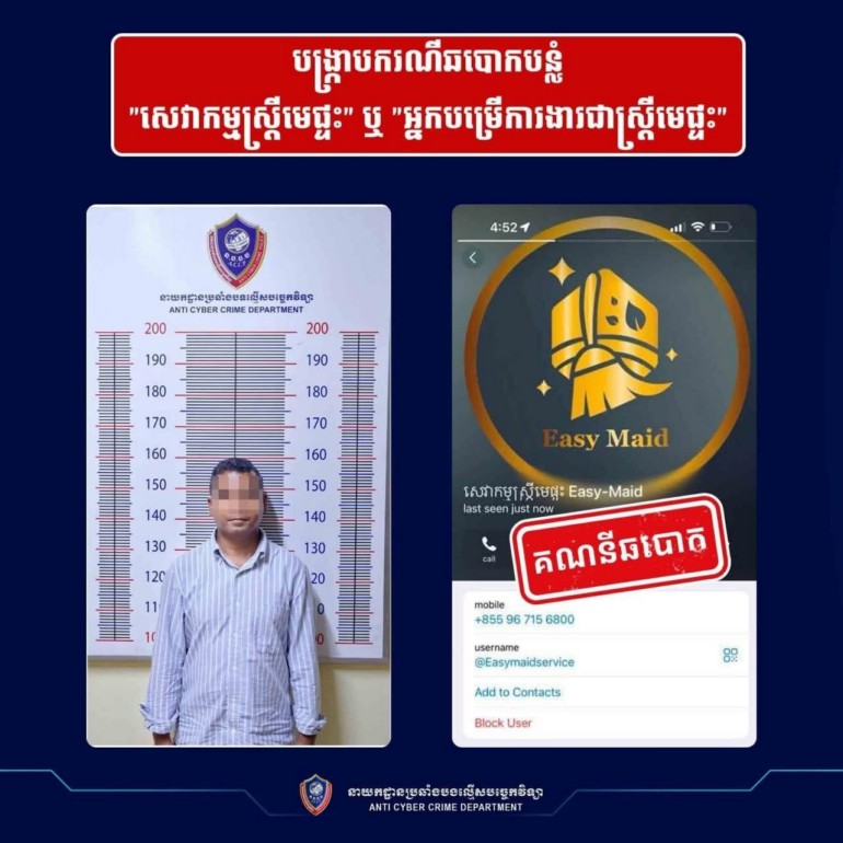 យោងតាមបទបញ្ជារបស់ ឯកឧត្ដម នាយឧត្ដមសេនីយ៍ ស ថេត អគ្គស្នងការនគរបាលជាតិ និងតាមការចង្អុលណែនាំពី ឯកឧត្ដម ឧត្ដមសេនីយ៍ឯក អគ្គស្នងការរងនគរបាលជាតិ នៅថ្ងៃទី២១ ខែកក្កដា ឆ្នាំ២០២៥ នាយកដ្ឋានប្រឆាំងបទល្មើសបច្ចេកវិទ្យា សហការជាមួយ ស្នងការដ្ឋាននគរបាលខេត្តសៀមរាប បានធ្វើការឃាត់ខ្លួនជនសង្ស័យ០១រូប ឈ្មោះ ឃ.ឡ អាយុ៣៨ឆ្នាំ ដែលជាម្ចាស់ផេកហ្វេសប៊ុក និង តេឡេក្រាម ឈ្មោះ «សេវាកម្មស្ត្រីមេផ្ទះ Easy-Maid»។ យោងតាមការទទួលពាក្យបណ្តឹងរបស់ជនរងគ្រោះ នាយកដ្ឋានបានទទួលពាក្យបណ្តឹងលើករណីនេះជាង៣០បណ្តឹង ដែលមានទំហំទឹកប្រាក់ប្រមាណជាង២ម៉ឺនដុល្លារ ប៉ុន្តែតាមរយៈការស្រាវជ្រាវ ជំនាញកំណត់បានថា ជនសង្ស័យរូបនេះបានធ្វើការឆបោកជនរងគ្រោះជាងរយនាក់ និងទំហំទឹកប្រាក់ប្រមាណជាង ១០ម៉ឺនដុល្លារតាំងពីឆ្នាំ២០២២មកម្លេះ។