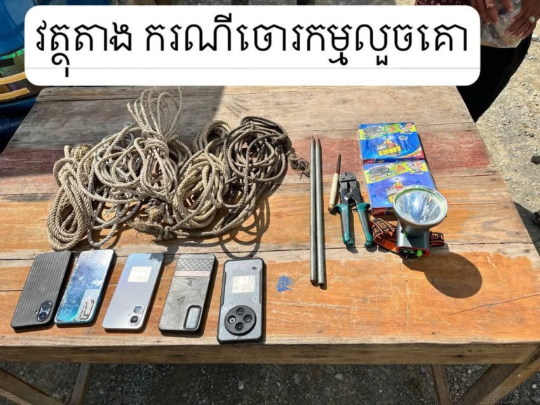 តាមការបញ្ជាក់ពីជំនាញបានអះអាងថា គោទាំងនេះពួកគេបានលួចនៅស្រុកជំគីរី ខេត្តកំពតដកហូតវត្ថុតាងរួមមាន: •រថយន្តកូរ៉េពណ៌ខៀវ ទ្រង់ជិត ០១គ្រឿង -ទូរស័ព្ទដៃ ០៥ គ្រឿង -គោ ០៦ ក្បាល -ដង្កាប់ ១ -ខ្សែគោ ៤ ខ្សែរ -ពិលកែវ ០១ -ធូបមូស ០២ ដុំ ។